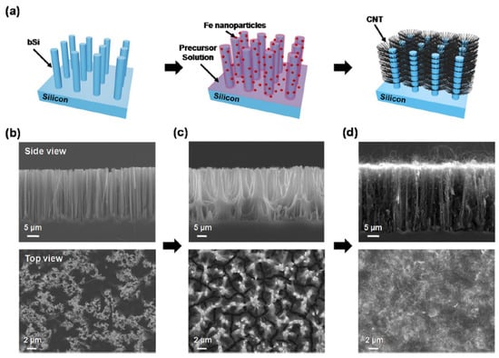 (a) Three-dimensional schematic illustration of the fabrication process for the bSi-CNT structure. (b–d) SEM images showing side views (top panels) and top views (bottom panels) of the bSi-CNT sample corresponding to (a). Reproduced from [105], under a Creative Commons license http://creativecommons.org/licenses/by/4.0/ (accessed on 7 October 2021).