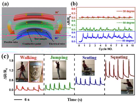 (a) Schematic of the 0.7 TPU/CNS test sample under bending with different bending degrees; (b) corresponding electrical signal of ΔR/R0 plotted as a function of cycle number under 30°, 50°, and 80° bending. (c) Response of a sensor to different human motion patterns (e.g., walking, jumping, seating, and squatting) when the sensor was mounted on the knee joint. Reprinted with permission from [108], Copyright© 2018, American Chemical Society.