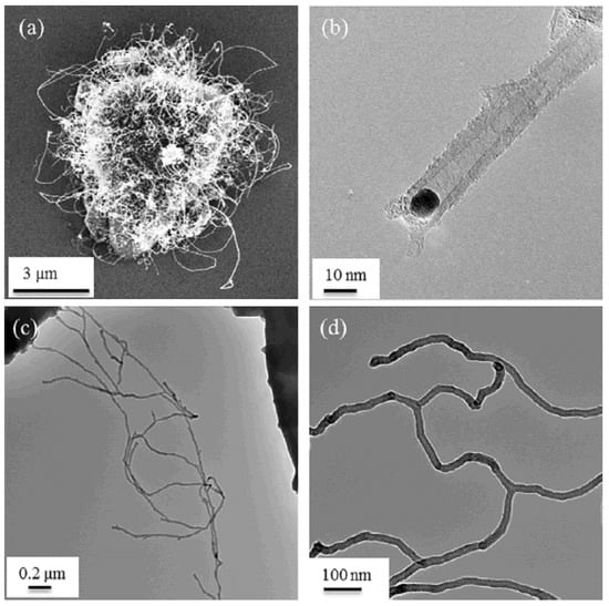 Lithium-ion batteries (LIBs) use oxides of the valuable elements Li, Co, Ni, and Mn in their cathode material. This accounts for about a third of the cost of the battery. However, cheaper technologies may not be commercially recyclable. Therefore, the main way to reduce their carbon footprint would be to make them more efficient, so that they are not only cheaper to begin with, but also last longer in service. LIBs mainly use graphitic materials in their anodes as they have good electrical conductivity, high crystallinity, and a layered structure. Graphite has a theoretical intercalation capacity of 372 mA·h·g−1 for the end compound LiC6 [43]. LIB anodes fabricated with branched CNSs (Table 1) together with transition metal sulfide or oxide NPs have high capacity and good cycle life [44,45,46,47,48,49]. The synergy of these NPs and branched CNSs leads to a hierarchical porous network with a large surface area, good electrical conductivity, and enhanced structural stability compared to conventional amorphous carbon. As an example, Chen et al. fabricated a b-CNT@SnO2@carbon sandwich-type heterostructure (Figure 3) as an LIB anode [44]. Scanning electron microscopy (SEM) images (Figure 4) confirmed the branched nature of CNTs (Figure 4a), which increased significantly in diameter upon inclusion of SnO2 in the structure (Figure 4b), which featured a “brush-like” morphology, with SnO2 nanorods stemming from CNTs (Figure 4c,d). Hierarchical architectures were attained also through iron oxide NP encapsulation inside CNTs, whose 3D networks were ozonized and used as substrates to further grow CNT branches, thanks to a catalytic effect of the iron NPs. This material showed high stability (>98% capacity retention up to 200 cycles at 100 mA·g−1 with a coulombic efficiency >97%, an outstanding rate capability (>70% capacity retention at 50–1000 mA·g−1 rates), and reasonable capacity of ca. 800 mA·h·g−1 at 50 mA·g−1 [50].