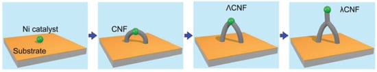 Currently, Ni, Co, Fe, and Cu or their alloys are used as catalyst particles to decorate CNFs or CNTs to form branches. The main but by no means only used [7] growth method is some form of chemical vapor deposition (CVD) process [8], which can be further modified, for instance through plasma enhancement, to increase the geometrical diversity of the resulting nanomaterials [9,10,11]. Earlier, Terrones et al. found that sulfur plays an important role in the formation of branched nanotube networks with stacked-cone morphologies [12]. In particular, sulfur acts as a CNT branching promoter, as its interaction with the C atoms favors the formation of non-hexagonal rings in the sp2 lattice, thus introducing a negative curvature in the case of heptagons (leading to branch opening) or a positive curvature in the case of pentagons (leading to tip closing) [12]. More recently, Huang et al. fabricated branched CNTs by a CVD process in the presence of thiols. They concluded that “sulfur in thiol may reduce the melting point of iron (Fe: 1535 °C, FeS: 1193 °C) during the pyrolysis process. This will result in the enlargement of iron particles which is responsible for nanotube growth”. This finding is important, as they noted that these larger particles were more likely to split into smaller ones, leading to branched nanotube growth [13].