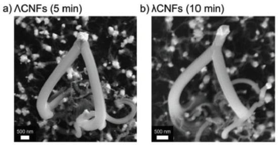 - Lutz, C.; Bog, U.; Loritz, T.; Syurik, J.; Malik, S.; Kumar, C.N.S.; Kübel, C.; Bruns, M.; Greiner, C.; Hirtz, M.; et al. Locally Controlled Growth of Individual Lambda-Shaped Carbon Nanofibers. Small 2019, 15, 1803944. [Google Scholar] [CrossRef]