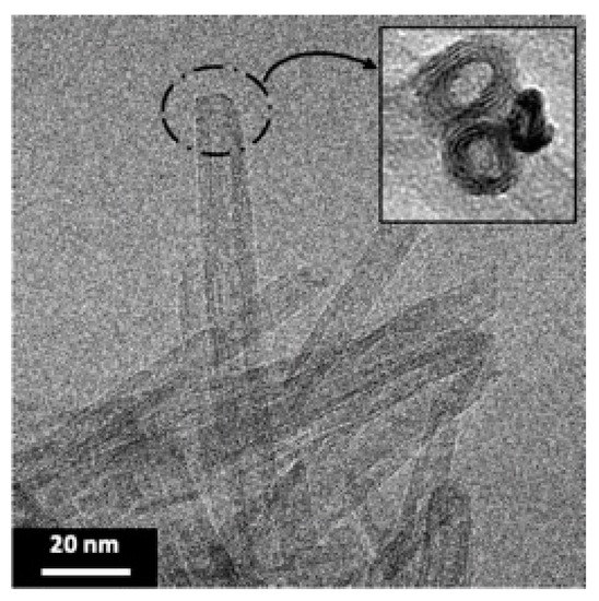 Transmission electron microscopy (TEM) is used to highlight the formation of TiONts with a coiled spiral-shaped structure and an internal cavity, as presented in Figure 2 and described in previous work [12,14,59]. They are 10 ± 1 nm in outer diameter, 4 ± 1 nm in inner diameter, as well as 170 ± 50 nm in length and they, present a high specific surface area due to their specific morphology (SBET = 174 ± 1 m2∙g−1).