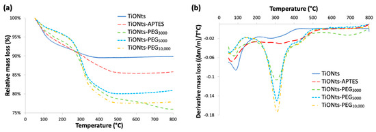 TGA (TA instrument, Discovery TGA, Newcastle, UK) was used to determine the amount of the molecules on the surface of the TiONts after each grafting step. All powders were analyzed with a temperature ramp of 10 °C∙min−1 from 50 to 800 °C under an airflow rate of 25 mL∙min−1. The experiments were reproduced from 2 to 10 times for each sample.