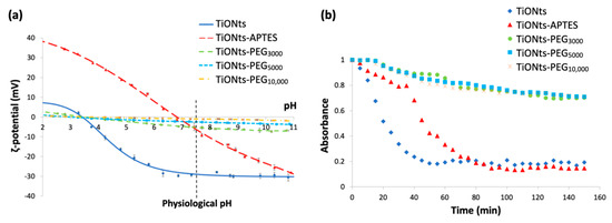 As shown in Figure 4a, ζ-potential measurements highlight the presence of PEGn on the surface of APTES-modified TiONts with the observation of a significant charge shielding for the different PEGylated chain lengths. This effect is clearly pronounced when the PEGylated chain length increases and even more in this synthesis pathway leading to higher PEG grafting yields when compared to the water pathway published earlier [14]. These measurements confirm TGA results by proving a PEG brush conformation as the carbon chain length tends to hide the charges present on the TiONts surface. ζ-potential is then close to 0 mV over the entire studied pH range. Thus, ζ-potential for TiONts-PEGn indicates an isoelectric point (IEP) at pH 3.5 and varies between 0 mV and −5 mV at physiological pH (pH 7.4) by suggesting that the steric effect mainly governed the colloidal stability at this pH value.