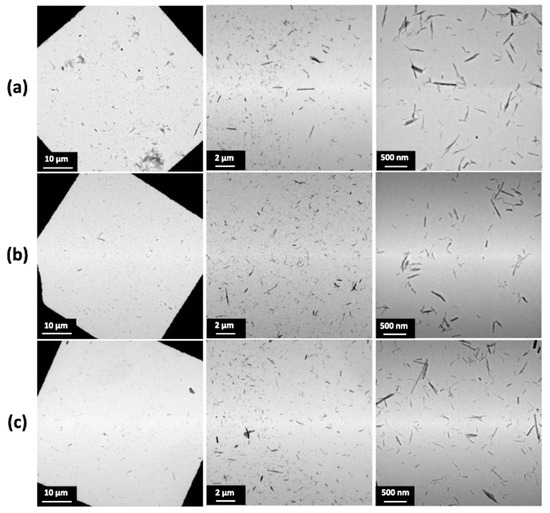 TEM images of TiONts-PEGn dispersion state: (a) TiONts-PEG3000, (b) TiONts-PEG5000, and (c) TiONts-PEG10,000.