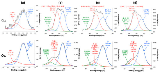 XPS spectra with the fitted peaks of C1s and O1s for (a) TiONts-APTES, (b) TiONts-PEG3000, (c) TiONts-PEG5000, and (d) TiONts-PEG10,000.