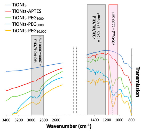 The FTIR spectra correlate with the TGA and XPS results by confirming the PEGn presence on TiONts surface, notably with a new C-OPEG specific band to the ethylene glycol repeat units (Figure 7). Indeed, the most intense vibration bands, attributed to C-OPEG at 1100 cm−1 (red highlight on FTIR spectra) and aliphatic carbons (CH/CH2/CH3) between 3000–2800 cm−1 and 1550–1250 cm−1 (dark gray highlight on FTIR spectra), can be assigned to the characteristic bonds of PEG. Once more the PEGn grafting thanks to DMSO/PyBOP showed more intense vibration bands by comparison with the EDC/NHS coupling in our previous study [14].