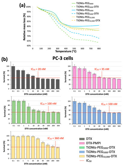 (a) TGA curves of TiONts-PEGn and TiONts-PEGn-DTX under air atmosphere. (b) Survival curves (MTS cytotoxicity assays) on PC-3 cell lines after incubation of DTX, DTX-PMPI, and TiONts-PEGn-DTX (mean ± SD) (the horizontal dotted lines allow for an estimate of the different nanohybrids’ IC50). The studied range was from 0.5 to 500 nM in DTX concentration, which corresponded to a concentration range of 4.5 × 10−3 to 4.5 μg∙mL−1, 5.75 × 10−3 to 5.75 μg∙mL−1, and 5 × 10−2 to 50 μg∙mL−1 for TiONts-PEG3000-DTX, TiONts-PEG5000-DTX and TiONts-PEG10,000-DTX, respectively.