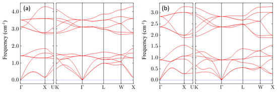 As a determination of the last stability condition, the dynamic response of these compounds is investigated by phonon calculation. The calculated phonon dispersions of CsNa2Bi and CsK2Bi along the high symmetry points in the Brillouin zone are shown in Figure 2a,b, respectively. No imaginary phonon frequency is found for these compounds. An imaginary phonon frequency, if it existed, would indicate that the structure is dynamically unstable (or has a phase transition) and vice versa [50]. Therefore, it is concluded that Cs(Na, K)2Bi materials are thermodynamically, mechanically, and dynamically stable. This proves that both compounds have a high degree of stability.