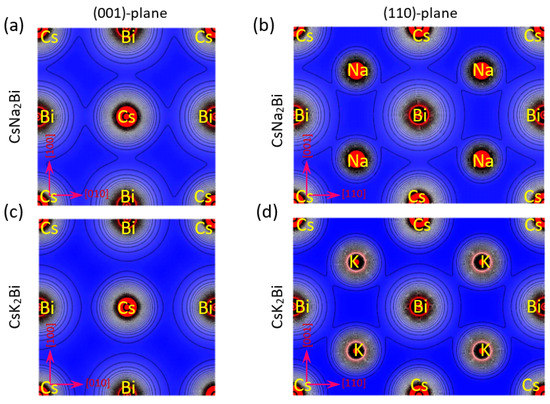 Electronic charge densities in (100) and (110) planes for (a,b) CsNa2Bi and (c,d) CsK2Bi compounds. It is evident from the valence charge density contour of the CsNa2Bi compound that the Bi charge density overlaps with Na and Cs, pointing to a covalent bond. In addition, the Cs-atom of CsK2Bi compound in the (001)-plane has a spherical electron charge density distribution with overlap with Bi and K, pointing to an ionic bond.