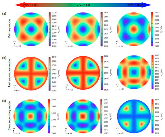 Due to the small values of the elastic constants of these structures, other properties such as the group wave velocities (Vg) and the phase wave velocities (Vp) may be interesting. Using the elastic constants and the density of these compounds, we can further determine the direction dependence of these properties. We calculated the Vg and Vp from elastic constants using the Christoffel equation [57] for both the longitudinal (L) wave velocity and the two transverse (T) modes. The two secondary modes, namely, the fast secondary mode (FS) and slow secondary mode (SS), correspond to the T-wave, and the single primary mode (P) is the L-wave [57]. Comparing these properties provides a measure of how the acoustic properties deviate from isotropy and allows for a direct comparison of the anisotropy among different materials. Figure 4, Figure 5, Figure 6 and Figure 7 show the calculated directional-dependent group and phase velocities of Cs(Na, K)2Bi for the primary and secondary modes at different pressures. It is observed that both compounds in the equilibrium state have approximately similar patterns in primary modes of phase velocity (Figure 4a and Figure 5a). This pattern has not changed in either compound after applying hydrostatic tension (V/V0 = 1.03), and only the maximum and minimum values of the P mode have been reduced. Under V/V0 = 1.0 and V/V0 = 1.03, Vp has maximum (minimum) values in the P mode along the [111] ([100], [010], and [001]) direction(s). In addition, Vp has maximum (minimum) values in the FS and SS modes along the (110)/(011)/(101) plane ([111] direction) and [100]/[010]/[001] direction ([110]/[101]/[011] direction), respectively (Figure 4b,c). For the two secondary modes (i.e., FS and SS modes) in an equilibrium state and under hydrostatic tension, the patterns have not changed, and the minimum and maximum values are in the [111] and [100] ([001] or [010]) directions, respectively. Although under hydrostatic tension, the change is not observed in the propagation patterns of the Vp, under hydrostatic compression, these patterns change significantly. For the CsNa2Bi under hydrostatic compression (V/V0 = 0.97), the propagation patterns of P, FS, and SS modes of Vp are reversed so that the direction of the minimum and maximum values are switched, as shown in Figure 4. As shown in Figure 5, such behavior does not exist in the phase velocity propagation pattern of CsK2Bi.