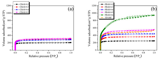 The N2/77 K isothermal adsorption–desorption curve reveals the surface area and pore structure of the activated carbon samples. As shown in Figure 1a, the adsorption–desorption isotherms of CB-AC are type I, according to the IUPAC classification [35]; thus, the pore structure of CB-AC contains many micropores. In addition, an H4-type hysteresis loop, normally associated with slit-shaped pores, was observed for all CB-ACs [35]. The isotherms of the PB-AC samples are shown in Figure 1b and are all type I, indicating a majority of micropores. In addition, we found that a longer activation time is associated with an increased specific surface area and number of mesopores. Therefore, as the activation time increased, the pore structure of PB-AC changed from microporous to mesoporous. In addition, with increase in the activation time, the hysteresis loops of the PB-AC samples increased, and the largest hysteresis loop was observed for the sample steam-activated at 900 °C for 60 min (i.e., PB-H-9-6).
