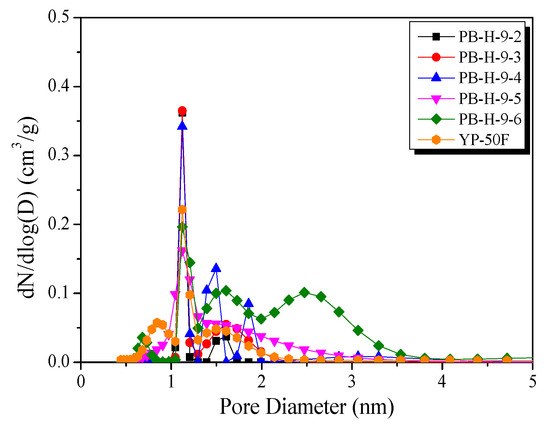 The PSD curves reveal the pore development. Figure 2 shows the PSDs of PB-AC obtained using NLDFT. In stage I, all PB-AC samples have narrow PSDs with pore diameters centered around 1.12 nm; thus, all PB-AC samples have similar pore diameters, but the volume of pores having diameters of 1–2 nm gradually increased with increase in activation time. In stage II, the pore distribution of PB-AC was centered around 1.12 nm but showed a decrease in the volume of pores having a diameter of 2–4 nm. The increase in the pore volume in activated carbon induced by physical activation occurs in two different ways: pore drilling (which results in a steady increase in pore diameter) and pore deepening (which has virtually no effect on pore diameter) [36]. Therefore, in stage I, the micropore volume was increased by pore deepening, and, in stage II, the mesopore volume increased by pore drilling. As shown in Table 1, the textural properties of commercial activated carbon (YP-50F) are similar to those of PB-H-9-5. Further, as shown in Figure 2, YP-50F and PB-H-9-5 have similar PSDs centered around 1.3 nm, but PB-H-9-5 has a higher mesopore volume (≥2 nm) than that of YP-50F.