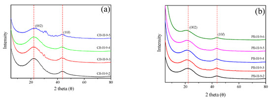 Figure 3 shows the XRD curves of the bamboo-derived activated carbon. The XRD patterns of CB-AC and PB-AC are typical of isotropic carbon materials, containing peaks corresponding to the C(002) and C(10l) planes [37]. As the activation time increased, the intensity of the peaks in the XRD patterns gradually decreased owing due to the oxidation of the crystalline phase. In the XRD pattern of CB-AC, peaks corresponding to ash were observed in addition to those arising from the C(002) and C(10l) planes of the carbon. In contrast, in the XRD pattern of PB-AC, only peaks corresponding to the C(002) and C(10l) planes of carbon were observed. Naturally derived carbon precursors contain large amounts of ash, but we assumed that the ash content of PB-AC is lower than that of CB-AC because the ash is removed together with monosaccharides (originating from hemicellulose and lignin) during the phosphoric acid stabilization process [38].