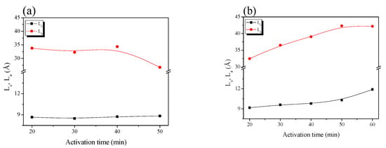 Figure 4 shows the crystallite height (Lc) and size (La) of the bamboo-derived activated carbon. Because the crystal structure of activated carbon is based on an sp2 carbon framework, a larger change in La than Lc was observed [24,39]. Further, CB-AC and PB-AC showed distinct changes in the crystal structures with increase in activation time. In the XRD patterns of CB-AC, La remained unchanged after treatment for 40 min, and Lc showed little change with increase in activation time. On the other hand, for PB-AC, both La and Lc increased with an increase in activation time. The difference in pore characteristics between CB-AC and PB-AC is considered to arise from the differences in the oxidation behavior of the crystals. However, it is important to note that XRD data provide information concerning the average crystallite size. Therefore, the increase in structural parameters (Lc or La) is considered to be a relative increase arising from the oxidation of amorphous or small crystals rather than crystal growth. On the other hand, the decrease in these structural parameters suggests that more oxidation reactions took place at the edges of the crystalline phase than in the amorphous phase. Therefore, the micropores and mesopores were formed in the activated carbon by the oxidation of amorphous regions or crystalline edges, respectively. Consequently, CB-AC has a lower specific surface area and total pore volume than PB-AC because oxidation mainly occurs at the crystal edges.
