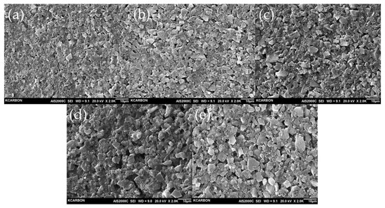 SEM images of the activated carbon electrodes (a) PB-H-9-3, (b) PB-H-9-4, (c) PB-H-9-5, (d) PB-H-9-6, and (e) YP-50F.