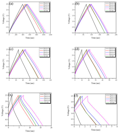 Charge–discharge curves of bamboo-derived activated carbon materials as a function of steam activation conditions obtained at (a) 0.1, (b) 0.5, (c) 1.0, (d) 2, (e) 5.0, and (f) 10.0 mV/s.