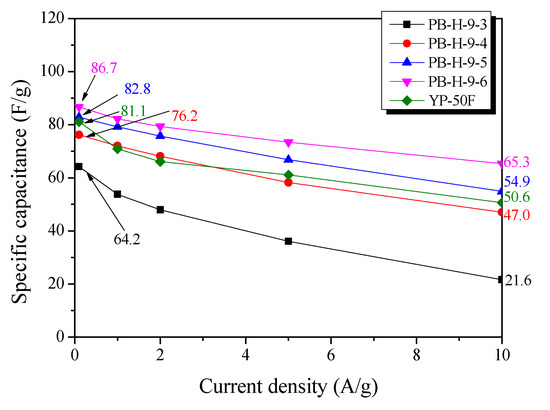 At a current density of 0.1 A/g, YP-50F and PB-H-9-5 have similar specific capacitances, but, at a current density of 10 A/g, the specific capacitance of PB-H-9-5 was approximately 8% higher than that of YP-50F. The changes in the specific capacitance with current density observed for PB-H-9-5 and YP-50F are considered to be closely related to the ion diffusion resistance. PB-H-9-5 has a micropore volume similar to that of YP-50F, but has a higher mesopore volume, and, thus, at a current density of 0.1 A/g, PB-H-9-5 and YP-50F have similar specific capacitances. However, at a current density of 10A/g, PB-H-9-5 has a lower ion diffusion resistance than YP-50F because of its higher mesopore volume. In conclusion, large micropore and mesopore volumes are required to achieve high energy and power densities, respectively, in EDLCs.
