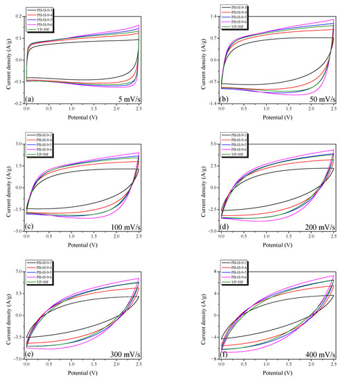 Figure 8 shows the CV curves obtained for the PB-AC electrodes at various scan rates (5–400 mV/s). The current densities in the CV curves are normalized with respect to the mass of the active electrode material. Interestingly, the trends in the CV curves are identical to those observed for the GCD curves in Figure 6. All the electrodes exhibit nearly ideal EDLC behavior, having rectangular CV curves at low scan rates. However, for all electrodes, at high scan rates, the shapes of the CV curves deviate significantly from the ideal rectangular shape. The sizes of the electrolyte ions in 1 M TEABF4/PC are 1.35 to 1.40 nm [13]. Thus, the CV curves of PB-H-9-3 to PB-H-9-6 show an ideal rectangular shape at low scan rates because they contain pores with diameters of 1.5–2.0 nm. However, as the scan rate increased, the rectangular CV curve of PB-AC became leaf-shaped because of the increase in internal resistance.