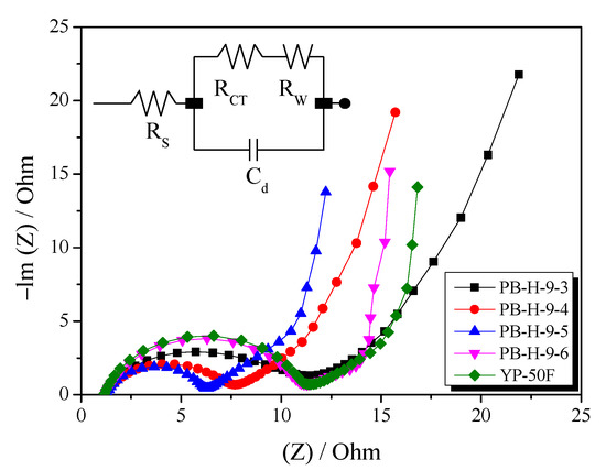 Figure 9 shows the Nyquist plots of the EDLCs prepared containing the PB-AC samples. The data about Nyquist plots were listed in Table 2. As shown in the Figure 8, as the activation time increased, the size of the semicircle decreased until an activation time of 50 min, after which the semicircle size increased. The diameter of the semicircle can be attributed to the interfacial resistance of the electrode pores and the electrolyte. Thus, the interfacial resistance decreased because the pore diameter increased with an increase in activation time (20 to 50 min). On the other hand, the interfacial resistance of PB-H-9-6 increased because of the formation of oxygen functional groups caused by the oxidation of the crystal edges [42].