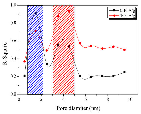 The electrochemical behavior of EDLCs is determined by the pore properties of the activated carbon. The crucial role of the pore structure in determining the performance of the EDLCs was confirmed through a correlation analysis between the pore volume, diameter, and specific surface area (Figure 10). At a current density of 0.1 A/g, a coefficient of determination (R2) of 0.9 was obtained at a pore diameter of 1.5 Å. These results indicate that the specific capacitance of the EDLC is determined by the volume of pores having diameters of 1.5 Å at a current density of 0.1 A/g. As mentioned above, the sizes of the cations and anions of 1 M TEABF4/PC electrolyte are 1.35 and 1.40 nm, respectively [13]. Thus, if the volume of pores having a diameter of 1.5 Å is predominant, the area for the adsorption of ions is large, resulting in a high specific capacitance. On the other hand, at a current density of 10 A/g, a broad bimodal PSD in the micropore regions (1.5 nm) and micropore and mesopore regions (widths between 3.5 and 4.5 nm) was obtained (Figure 10). This means that, to achieve a high specific capacitance at a current density of 10 A/g, both the surface area for the adsorption of ions and the diameter of the passages through which ions can move through the micropores without significant resistance are important.