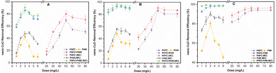 In the aquatic environment, the pH plays an important role in the surface potential of nano-CuO and also affects the formation of flocculant hydrolysates. The removal efficiency of PAM was mainly influenced by the solution pH due to a positive charge at acidic and alkaline conditions. Under the acidic environment, the hydroxyl groups on the surface of nano-CuO adsorbed protons and thus were positively charged, while PAM released cations in the solution, resulting in the poor removal efficiency of NPs. The surface potential of CuO above pH 7 was negatively charged owing to the loss of protons. The release of cations due to the ionization of PAM neutralized the surface charge thereby enhancing the removal due to formation of large aggregated flocs in the system [29]. However, under highly alkaline pH environments, both NPs and PAM were negatively charged thus increasing the electrostatic repulsion amongst them, and so reducing the overall flocculation and precipitation efficiency. Furthermore, under alkaline conditions, PAFC rapidly hydrolyzed and precipitated to form hydroxide, thereby reducing the overall removal efficiency of NPs. The effect of nano-CuO destabilization was enhanced by increasing the solution pH following the addition of PAFC; however, the tiny flocs remained suspended in the solution [30]. The compounding process of PAFC/PAM was relatively more stable than PAFC and PAM alone due to the wider pH adaptation range of organic flocculant (PAM) [31,32]. Moreover, the complex structure of the PAFC/PAM polymer remarkably enhanced the flocculant-specific surface area and improved the bridging effect during adsorption [32]. Consequently, the combination of inorganic and organic flocculants had a synergistic effect on the C/F/S process and on the overall nano-CuO removal performance from the aquatic environment.