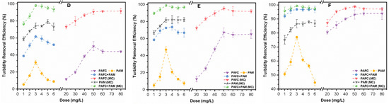In the PAFC case, the optimal settling period of CuO was found to be shorter than that of PAM alone. The ionization of PAFC released Fe(III) and Al(III) ions in the solution, leading to the formation of complexes with nano-CuO. Moreover, PAM contained the reactive groups in its polymer chains which provided the favorable adsorption sites for tiny flocs of CuO. Thus, the removal of nano-CuO by PAM mainly occurs via the adsorption bridging mechanism [34]. These observations are consistent with the literature [35], which reported similar turbidity removal rates of the kaolinite−humic acid solution using PAFC and PAM−PAFC. In the PAFC/PAM case, stable nano-CuO (10 mg/L) and turbidity removal rates of up to 97.85% and 96.45%, respectively, were observed after 15 min as shown in Figure 3C,F. The enhanced removal efficiency may be related to the bridging effect of PAFC/PAM, which forms dense and stable flocs that rapidly settle down. In contrast, the flocs formed by PAFC and PAM alone were small and had longer settling times. Thus, the combination of organic and inorganic flocculants, i.e., PAFC/PAM can significantly decrease the treatment cost by reducing the settling time.