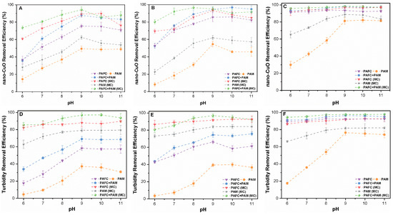 Influence of pH (6–11) on the removal efficiency of nano-CuO and turbidity for various mass concentrations (A,D) 1 mg/L, (B,E) 2.5 mg/L and (C,F) 10 mg/L.