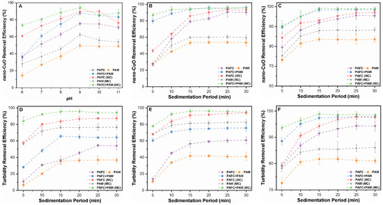 Influence of settling time (5–30 min) on the removal efficiency of nano-CuO and turbidity for various mass concentrations (A,D) 1 mg/L, (B,E) 2.5 mg/L and (C,F) 10 mg/L.