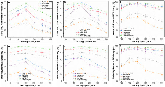 Influence of stirring speed (100–350 RPM) on the removal performance of nano-CuO and turbidity for various initial mass concentrations (A,D) 1 mg/L, (B,E) 2.5 mg/L and (C,F) 10 mg/L.