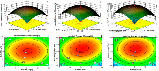 3D surface plots and corresponding contour plots showing the removal rate of nano-CuO under the influences of (A–D) PAFC dosage and PAM dosage, (B–E) PAFC dosage and stirring speed and (C–F) PAM dosage and stirring speed.