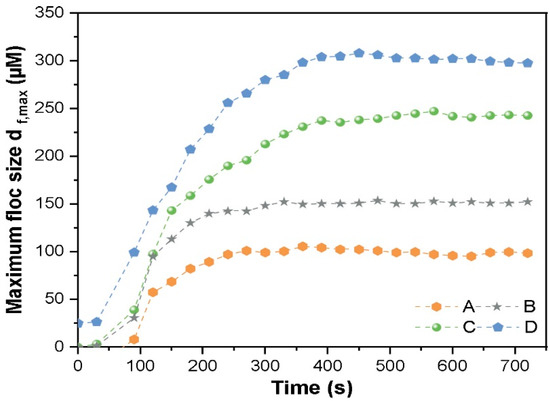 Size of composite floc of nano-CuO (2.5 mg/L) under various conditions at (A) 50 mg/L PAFC, (B) 50 mg/L PAFC + 20 mg/L MC, (C) 50 mg/L PAFC with 3 mg/L PAM and (D) 50 mg/L PAFC + 3 mg/L PAM and 20 mg/L MC.