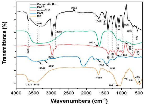 FT-IR spectrum of pristine chemicals, i.e., MC, PAM, nano-CuO, PAFC and composite flocs obtained at optimum C/F/S conditions.
