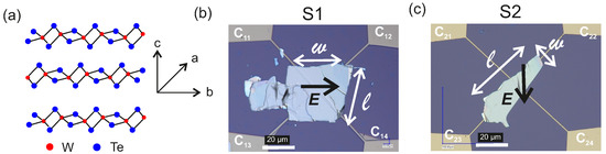 A schematic representation of the semimetallic bulk crystal structure of -WTe highlighting the , and directions of the space group () distorted orthorhombic basis, is shown in Figure 1a. Each unit cell is composed of two W and four Te atoms and the W-Te bond lengths vary between and [40,50]. The bulk WTe exhibits a stacking order in which the atoms in the upper layer are rotated by 180 w.r.t. the atoms in the lower layer, as sketched in Figure 1a. In the -WTe, the a-axis is populated by the W-chain while the axis b is orthogonal to it. The axis is perpendicular to the plane. Two exemplary samples are considered, namely: