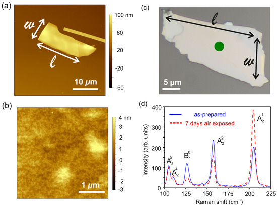 where , , and are Raman active phonon modes. In this work, the Raman modes have been excited along the axis of the WTe crystal, i.e., the laser beam is directed perpendicular to the plane of the WTe flake and of the substrate. Since the Raman excitations reported here are unpolarized, neither the incident, nor the scattered electric field vectors and are aligned along the or axes. An optical microscopy image of the flake studied by Raman spectroscopy is shown in Figure 2c, while the room temperature Raman spectra recorded for the as-prepared and air aged WTe flake are given in Figure 2d. A total of five Raman active modes with peaks centered at 105.0 cm, 110.5 cm, 126.5 cm, 157.2 cm, and 205.3 cm have been recorded. The Raman active modes are labelled as and , where and to uniquely identify the Raman mode. Here, the five detected Raman peaks are assigned to the , , , , and allowed Raman active modes [50,51]. Upon comparison with the calculated resonances, it is found that the experimental is blue shifted, while the other four Raman active modes are red shifted due to the stress built up when the flake is transferred onto the rigid substrate. Upon measurement, the sample has been exposed to air for seven days and then Raman spectra have been recorded. The Raman spectrum for the air aged sample, represented by the dashed curve in Figure 2d is found to show the allowed Raman modes of the optical phonons as recorded for the pristine flake. No peaks related to oxides of Te or W are detected, confirming the chemical stability of the WTe flakes.
