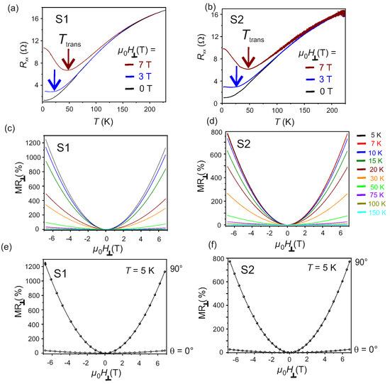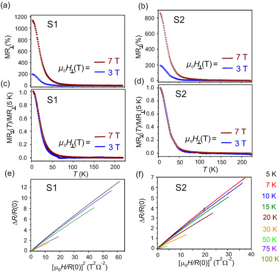 is a fingerprint of the microscopic physical mechanism governing the electronic properties of any trivial or non-trivial electronic system. Here, and are the resistances of the system under an applied field and in zero field, respectively. The of the two samples S1 and S2 are estimated as a function of an applied field at different T in the range and are reported in Figure 4c,d. Large positive ∼1200% and ∼800% are found at , under the maximum applied field for S1 and S2, respectively. The estimated for both samples follow the power-law behavior [42,54], where is a proportionality constant and is the power index. The value of n is estimated by numerical fitting of the behavior for both S1 and S2 as a function of and is found to be in the range [35,40,41,42]. It is noted, that no Shubnikov-de Haas (SdH) oscillations have been observed in the of both samples, even up to the maximum . The as a function of for and are also recorded for S1 and S2 and reported in Figure 4e,f, respectively. An anisotropic behavior of is observed for the -WTe flakes studied here [7,15,42,53].