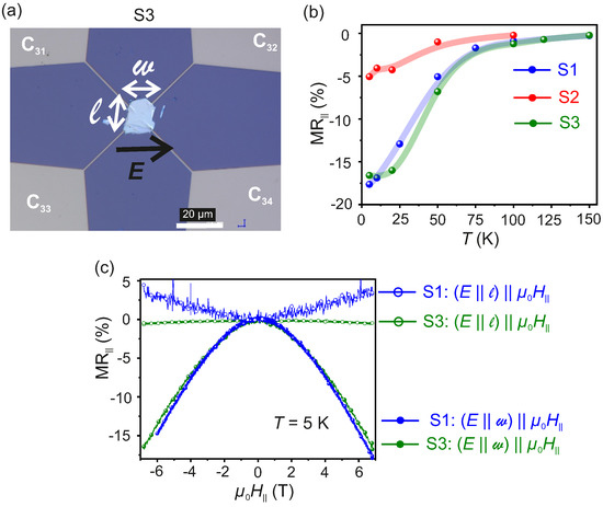 To prove that is the necessary and sufficient condition to observe chiral anomaly in WTe and to confirm the reproducibility of the obtained results, a third sample S3 is fabricated following the methods described above and the is measured as a function of T. For S3 in the van der Pauw geometry, is applied between the contacts and while is measured across and , so that E is along w, as shown in the optical microscopy image given in Figure 8a. The value of measured for as a function of T is reported in Figure 8b for S1, S2 and S3. The measured persists up to for both S1 and S3, while for S2 the negative survives up to . As seen in Figure 8b, the magnitude of and its dependence on T are identical for S1 and S3, while the magnitude of for S2 is reduced. This is due to the slight misalignment of the axis w.r.t. in S2. The critical T below which chiral anomaly can be observed in thin flakes of WTe reported in this work is at least four times higher than the one reported by Li et al. [34] who observed chiral anomaly up to 30 K. In contrast to those reported in literature [34], the WTe flakes used in this work are not exposed to any chemical or e-beam irradiation during the sample fabrication process. The pristine nature of the flakes used in this work is taken to be the reason for the observed critical temperature of 120 K. Additionally, the magnitude of measured at and for S3 is one order of magnitude higher than the one already reported [34,63].