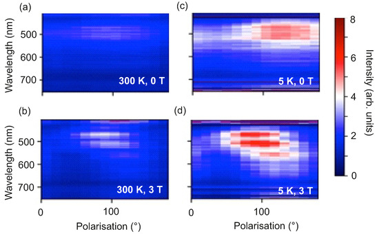 The spectrum of the generated supercontinuum pulses, measured after passing the beam through a color filter and a polarizer, is shown in Figure 9a for two perpendicular linear polarization directions corresponding to the electric field of light , defined as: (i) and (ii) , such that is respectively parallel and perpendicular to the long axis l of the measured WTe flake, as shown in Figure 9b. The spectrum spans the spectral range between 450 nm to 700 nm and does not depend on the direction of the linear polarization. a detailed investigation (with longer acquisition time to increase the signal-to-noise ratio) for the two polarizations and is performed and the results are presented in Figure S2 of the Supplementary Materials. The measured reflectivity spectra are normalized with respect to a reference spectrum recorded by diverting the laser beam before the sample and are reported in Figure 10a–d as a function of the polarization angle, of T, and of . The spectra are shown as 2-dimensional (2D) maps, where the intensity is encoded in color scale. As discussed in detail in the Supplementary Materials and shown in Figure S3, the reflectivity spectra recorded both at and show a dependence on , that is more pronounced for than for . This anisotropic behavior is in agreement with what observed in the magnetotransport studies. Moreover, a comparison of the spectra recorded at a fixed T reveals that the changes in the spectra upon application of are more evident for then for . This behavior is elucidated quantitatively by evaluating the anisotropy A defined as: