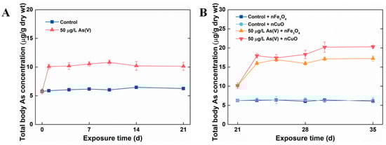 Dynamics of total body As concentrations in mussels without MNPs (A) and with MNPs (B). Data are mean ± SD (n = 4).