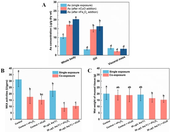 As Distribution before and after exposed to nFe3O4 and nCuO in mussels (A). Na+-K+-ATPase (NKA) activities in mussels exposed to different treatments at the end of the exposure (B). Body weight of mussels at the end of single As(V) exposure and co-exposure (C). Values are the mean ± SD (n = 6). Significant differences (p < 0.05) among exposure conditions were represented with different letters. Control: Mussels exposed to artificial seawater for 21 days (single exposure). Control + nCuO: Mussels exposed to 1 mg/L nCuO for 2 weeks after control exposure (co-exposure). Control + nFe3O4: Mussels exposed to 1 mg/L nFe3O4 for 2 weeks after control exposure (co-exposure). 50 μg/L As(V) only: Mussels were cultured in 50 μg/L As(V) solution for 21 days (single exposure). 50 μg/L As(V) + nCuO: Mussels exposed to 50 μg/L As(V) + nCuO for 2 weeks after 50 μg/L As(V) exposure (co-exposure). 50 μg/L As(V) + nFe3O4: Mussels exposed to 50 μg/L As(V) + nFe3O4 for 2 weeks after 50 μg/L As(V) exposure (co-exposure).