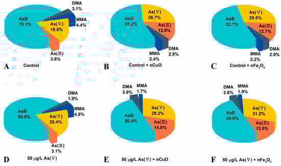 Content of As speciation in mussels after different exposure (organic monomethylarsonic acid (MMA), dimethylarsinic acid (DMA), and arsenobetaine (AsB)). (A) Control: Mussels exposed to artificial seawater for 21 days. (B) Control + nCuO: Mussels exposed to 1 mg/L nCuO for 2 weeks after control exposure. (C) Control + nFe3O4: Mussels exposed to 1 mg/L nFe3O4 for 2 weeks after control exposure. (D) 50 μg/L As(V) only: Mussels were cultured in 50 μg/L As(V) solution for 21 days. (E) 50 μg/L As(V) + nCuO: Mussels exposed to 50 μg/L As(V) + nCuO for 2 weeks after 50 μg/L As(V) exposure. (F) 50 μg/L As(V) + nFe3O4: Mussels exposed to 50 μg/L As(V) + nFe3O4 for 2 weeks after 50 μg/L As(V) exposure.