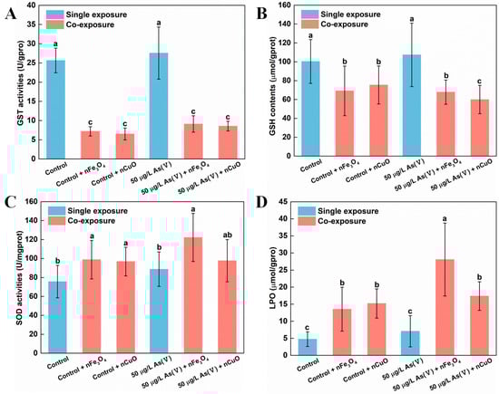 Biomarker values in mussels after different exposure. (A) GST activities, (B) GSH contents, (C) SOD activities and (D) LPO levels in mussel exposed to different treatments at the end of the exposure (mean ± SD, n = 6). Significant differences (p < 0.05) among exposure conditions were represented with different letters. Control: Mussels exposed to artificial seawater for 21 days (single exposure). Control + nCuO: Mussels exposed to 1 mg/L nCuO for 2 weeks after control exposure (co-exposure). Control + nFe3O4: Mussels exposed to 1 mg/L nFe3O4 for 2 weeks after control exposure (co-exposure). 50 μg/L As(V) only: Mussels were cultured in 50 μg/L As(V) solution for 21 days (single exposure). 50 μg/L As(V) + nCuO: Mussels exposed to 50 μg/L As(V) + nCuO for 2 weeks after 50 μg/L As(V) exposure (co-exposure). 50 μg/L As(V) + nFe3O4: Mussels exposed to 50 μg/L As(V) + nFe3O4 for 2 weeks after 50 μg/L As(V) exposure (co-exposure).