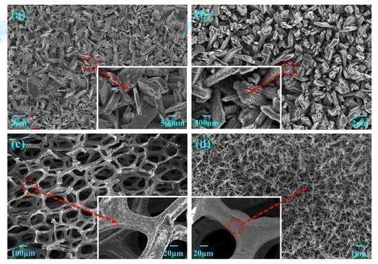 The Cu NWs/CF was synthesized in the following successive sequence: alkaline oxidation [], high temperature dehydration, and electroreduction methods []. In detail, a piece of CF (2 cm × 5 cm) was first placed in an aqueous solution containing 2.5 mol L−1 sodium hydroxide and 0.125 mol L−1 sodium persulfate for 4 min to obtain Cu(OH)2 nanowire electrodes. Secondly, a pre-prepared Cu(OH)2 nanowire electrode was annealed at 180 °C for 180 min to obtain CuO nanowire electrodes. Thirdly, the CuO nanowire electrode was reduced in a typical three-electrode system for 30 min at −1 V (vs. Ag/AgCl) with 1 mol L−1 Na2SO4. After washing and drying, a Cu NWs/CF electrode was finally prepared.