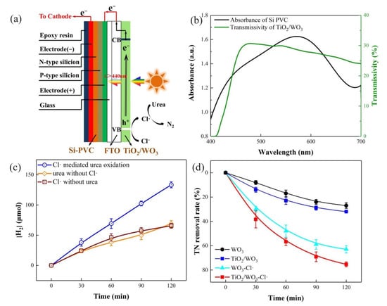 (a) Schematic diagram of TiO2/WO3/Si PVC composite photoanode; (b) absorbance of Si PVC and transmissivity of TiO2/WO3 electrode; (c) hydrogen generation under different conditions; (d) TN removal rate during a 2 h operation under different conditions. Conditions: 20 mg L−1 urea; 50 mmol L−1 Na2SO4; 75 mmol L−1 NaCl; solution pH = 7.