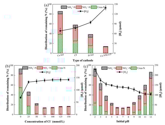 Effect of (a) cathode type; (b) Cl− concentration; and (c) initial pH upon hydrogen generation and TN removal. Conditions: urea 20 mg L−1; 50 mmol L−1 Na2SO4.