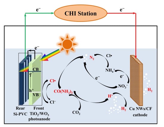 Inspired by these points, a self-driving nano photoelectrocatalytic (PEC) system was developed to efficiently produce H2 and remove TN for urine treatment under neutral pH conditions. TiO2/WO3 nanosheets, with high catalytic activity, stabilization, and visible-light response due to the lattice matching and energy band alignment between WO3 and TiO2 [], was used as photoanode to generate Cl• and HO• [] for the conversion of urea-nitrogen (Urea-N) to N2, and the enhancement of hydrogen generation [], respectively. Cu NWs/CF were employed as the cathode to produce H2 and simultaneously eliminate the over-oxidized nitrate-nitrogen. The impressive results in H2 generation and TN removal also benefitted from the design of a self-bias photoanode, which consisted of confronted TiO2/WO3 nanosheets and a rear Si photovoltaic cell (Si PVC), in which the TiO2/WO3 mainly absorbed short-wavelength light and generated electron/hole pairs, and the Si PVC captured the filtered long-wavelength light and caused photovoltage, to highly promote the separation of photogenerated charges of the PEC system without the use of external voltage []. The results proved the synergistic effect of urea oxidation and H2 generation. Additionally, this PEC system could achieve rapid TN removal from urine, indicating that the system could realize urine rapid purification and energy recovery. Hence, this work proposes an efficient and promising method for urine H2 generation and TN removal.