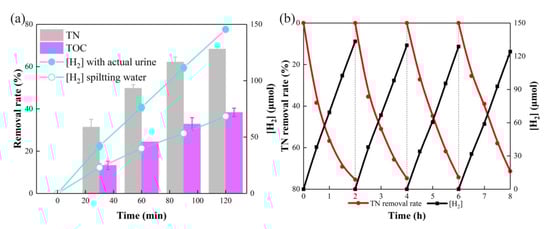 In order to investigate the practical application potential of the PEC system, the application of actual urine and the stability of the system were tested. Actual urine was obtained from 5 healthy volunteers, filtered, and diluted to an appropriate concentration for practical application tests, which contained approximately 0.34 mol L−1 urea, and 474.9 mmol L−1 Cl−. Figure 6a showed that H2 generation was 72.73 μmol h−1 with actual urine, 2.13 times greater than splitting water, indicating that the presence of actual urine greatly promoted the generation of H2, without the addition of extra alkali. The urine TN removal rate reached 68.36% after a 2 h operation under optimal conditions, and after a 4h operation, the TN removal rate reached 84.9% due to a continuous reduction of NO3− on the cathode. The TOC removal rate also reached 38.4% in 2 h. It indicated that the system could achieve TN removal from actual urine.