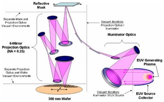 Lately, the resolution has been enhanced by substituting the deep ultraviolet (DUV) wafer scanners with novel devices that use soft X-ray radiation, also called extreme ultraviolet (EUV) radiation at λ = 13.5 nm []. A further reduction in the working wavelength to 6.7 nm and the use of beyond extreme ultraviolet (BEUV) radiation will boost the performance of microprocessors even more [,]. Significant efforts were directed into this direction by ASML, which is the world’s largest manufacturer of DUV and EUV lithographical equipment [,,,,].