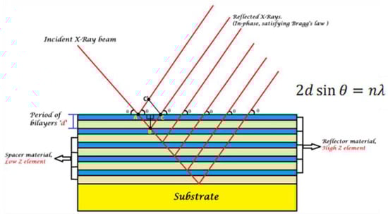 The weak reflection of soft X-ray radiation by solids demands advanced reflective optical equipment. Immediately after the discovery of X-rays, it was stated that the refractive index of all materials is very small (∼10−5) []. Later, by discovering X-ray diffraction from crystals, the method of deflecting X-rays was provided for the first time []. A new version of X-ray diffraction has evolved over the past 25 years by building well-defined artificial diffracting structures instead of natural crystals to manipulate X-rays. Usually, such artificial structures consist of periodically alternated nanolayers of two materials, as shown in Figure 3. Thus, the reflectivity of X-rays is amplified due to the multiplication of interfaces. Such structures are called periodical multilayer X-ray mirrors (PMMs).