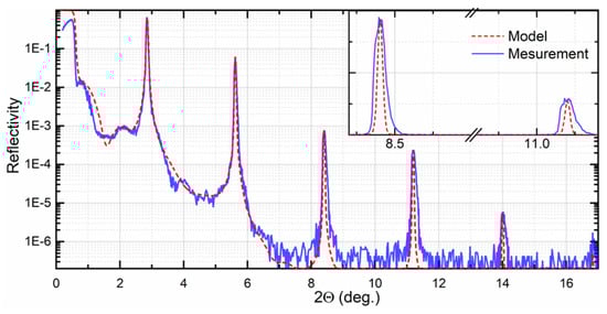 The structural uniformity implies the regularity of the thickness of the layers and interface structure across the whole multilayer stack. Apparent errors in the thickness of individual layers or their continuous variation (drifting) caused by various factors deteriorate the uniformity. Preserving structural uniformity is essential for maintaining Bragg’s diffraction condition. The nature of the periodicity is defined mainly by the deposition rate’s time stability and maintenance of the substrate temperature []. The degree of the uniformity can be quickly evaluated by low-angle X-ray reflectometry [], and manifests itself in the form of broadening of diffraction peaks, as shown in Figure 6. The real structure suffers from the gradual increase in the interlayers due to the increase in the substrate temperature during the deposition. The theoretical model implies the ideally periodical structure. The inset shows the broadening of the diffraction peak due to low structural uniformity.